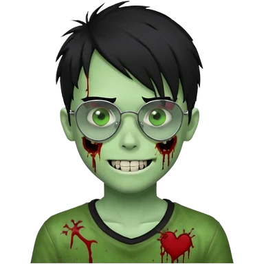 Zombie emo boy, green skin and black hair, chrome heart glasses and a scary smile, scars and blood under eyes emoji