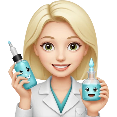 A smiling beautician with cold, calculating eyes, pointing at your cheek while holding an expensive serum bottle. Fake smile, predatory vibe. emoji
