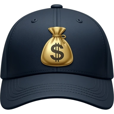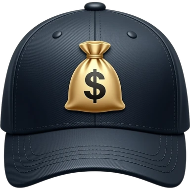 (вид сверху): темная бейсболка. На козырьке сверху глянцевый принт мешка с деньгами. Текстура сукна. Контрастное освещение, яркие золотые детали. emoji