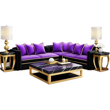 Luxurious black marble living room with gold and white accents and with a purple accented pillow emoji