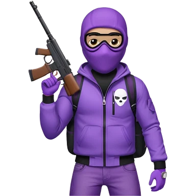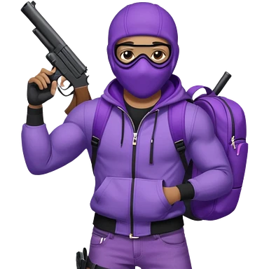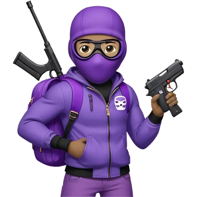 YN wearing a ski mask, holding a gun, purple jeans, Sprayground bookbag, confident stance emoji