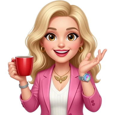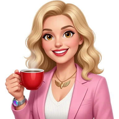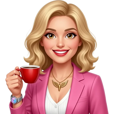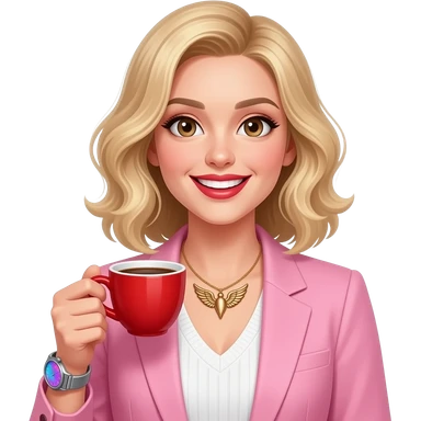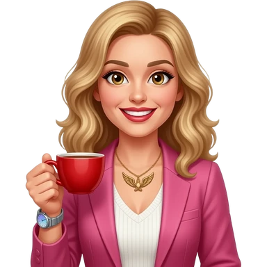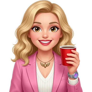 Slightly wavy blonde hair + Big light brown eyes with spark + happy teeth smile + bronze color angel wing necklace + armwatch with blue&pink hologram dial and silver band + red lipstick + pink blazer + white pullover with open neck + with red coffee cup porcellain with handheld emoji