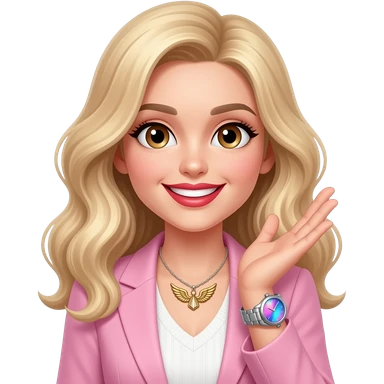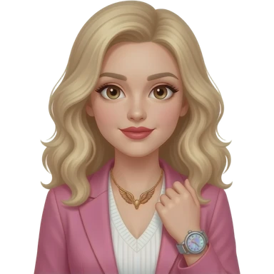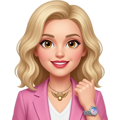 Slightly wavy blonde hair + Big light brown eyes + bronze color angel wing necklace + armwatch with blue&pink hologram dial and silver band + red lipstick + pink blazer + white pullover with open neck emoji