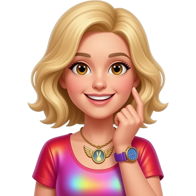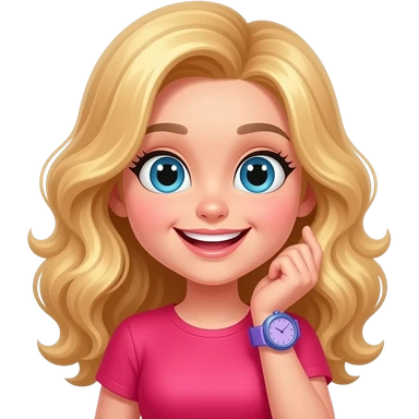 blonde hair slight wavy, slight rabbit front teeth, big eyes, happy colorful (pink/red) with colorful watch (hologram like purple-blue) emoji