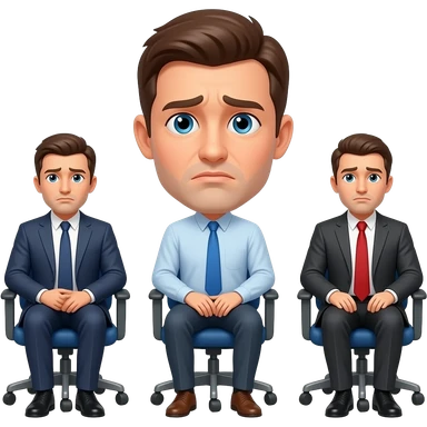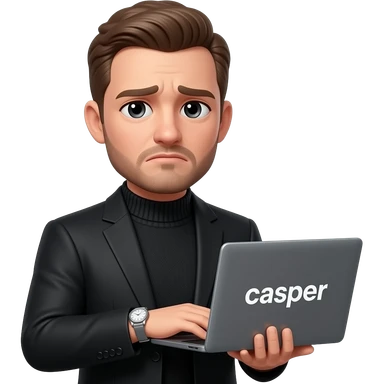 little grown beard freshly shaven, brown hair and eyes black suit jacket black fisherman neck pullover, laptop with casper text on pc , this memoji format stays. and add silver watch sad face emoji