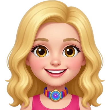blonde hair slight wavy, slight rabbit front teeth, big eyes light brown, happy colorful (pink/red) with colorful watch (hologram like purple-blue) emoji