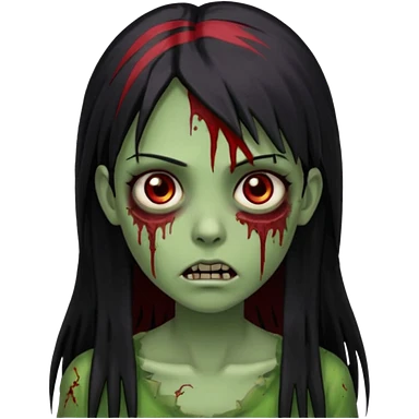 Garota zumbi com cabelo todo preto liso, longo e mechas vermelhas na lateral da cabeça dos dois lados. Olhos castanhos escuros, pele esverdeada como se estivesse podre e vários ferimentos emoji