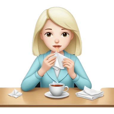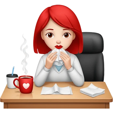 хвора дівчина сидить в офісі за столом, у неї в руках хустинка, червоний ніс, на столі серветки, чай emoji
