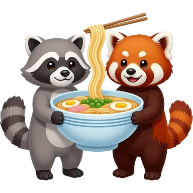 Mapache y panda rojo comiendo juntos un ramen emoji