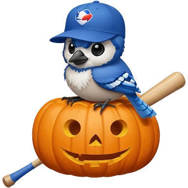 bluejay wearing MLB bluejay baseball hat perched on one blue baseball bat sitting on a Halloween pumpkin emoji