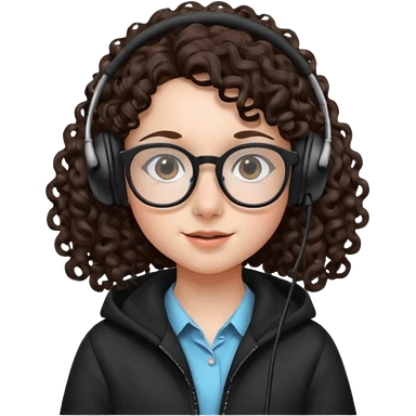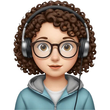 brunette kid with unique face features and very curly long hair kid girl neutral and big glasess and big nose and dark eyes with freckles kind of nerd looking and headphone wearing emoji