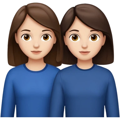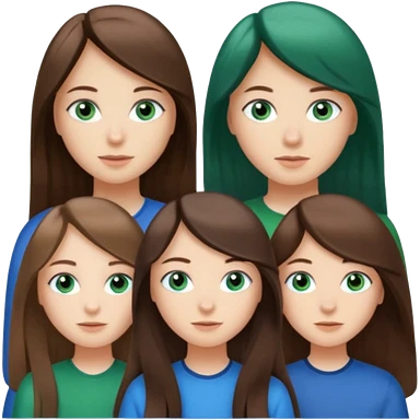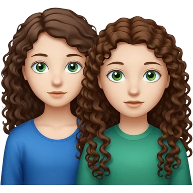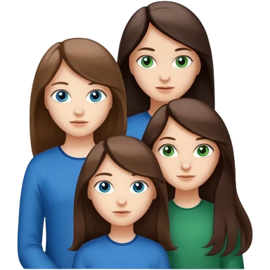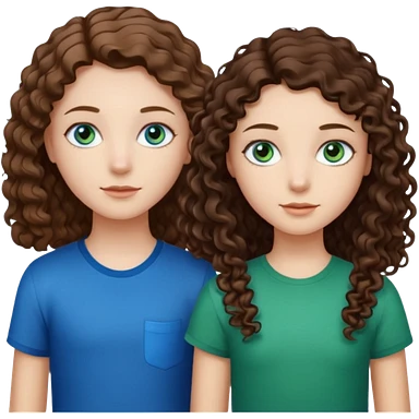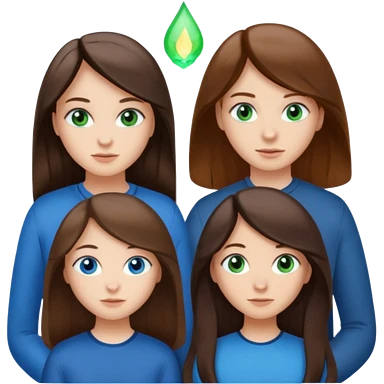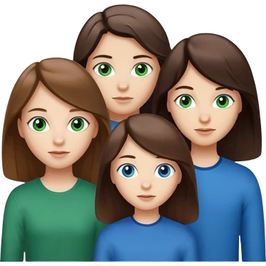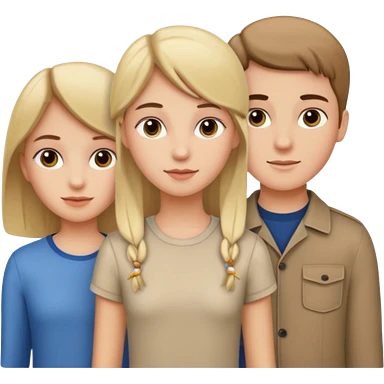 Three people total: Two girls brunette one with straight long hair and blue eyes one with curled hair middle length and green eyes and the other a boy lighter brown with blue eyes emoji