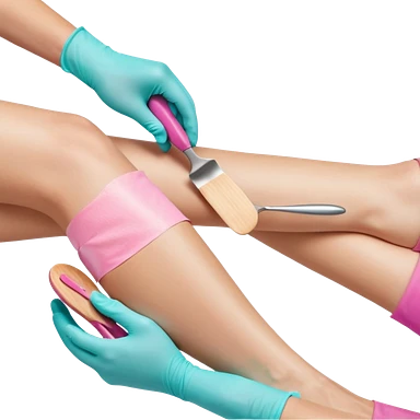 Close-up professional beauty photo of a smooth white leg during a waxing procedure, a second person’s hand wearing a turquoise nitrile glove spreading warm pink depilatory wax along the leg with a wooden spatula emoji