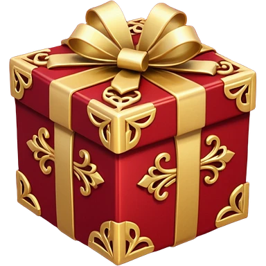 Create a highly polished, 3D game UI–style gift box with a luxurious red and gold theme. gift box ,The square box features deep crimson-red panels with ornate gold metallic trim and filigree details along the edges. emoji