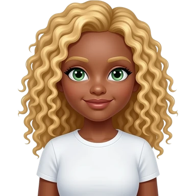 Делай тёмно кожу блондинку с кудрявыми волосами и с зелёными глазами в футболке скимс с белым цветом но не сильно тёмный смуглый светлей emoji | AI Emoji Generator
