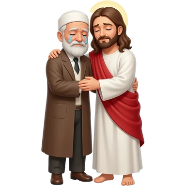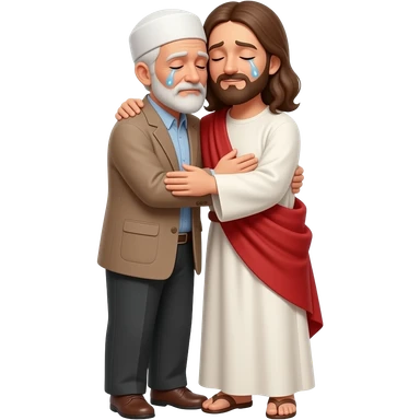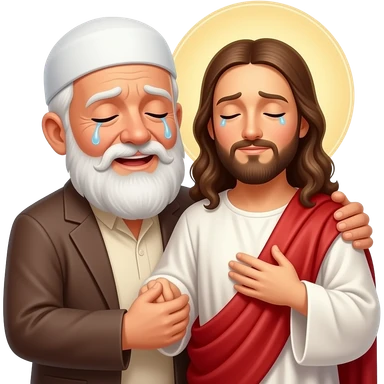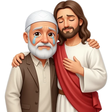 пожилой мужчина мусульманин со слезами на глазах обнимает Иисуса во весь рост emoji