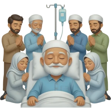 нарисуй каи пожилой мужчина мусульманин лежит под капельницей с закрытими глазами и вокруг него люди, которые молятся emoji
