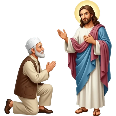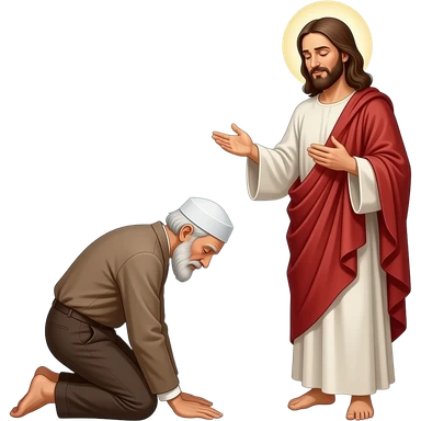 пожилой мужчина мусульманин стоит на коленях перед Иисусом, который стоит перед ним emoji
