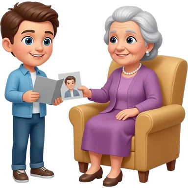 внук дарит пожилой бабушке в кресле седой открытку emoji
