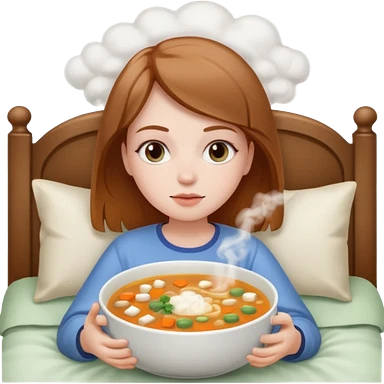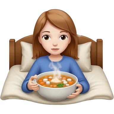 tazita de sopa, pastillas al lado y una chica en una cama emoji
