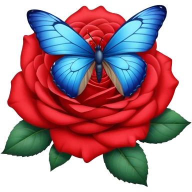 Realistic, detailed curled soft petals red rose, blue butterfly emoji