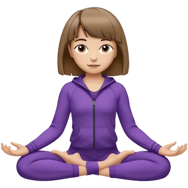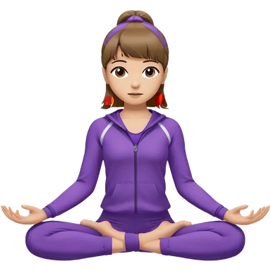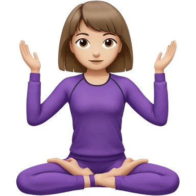 Девушка с короткими волосами до плеч русого цвета, посередине головы есть чёлка, с черными бровями, карие глаза, у неё фиолетовый спортивный костюм, она занимается йогой emoji