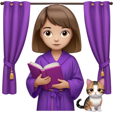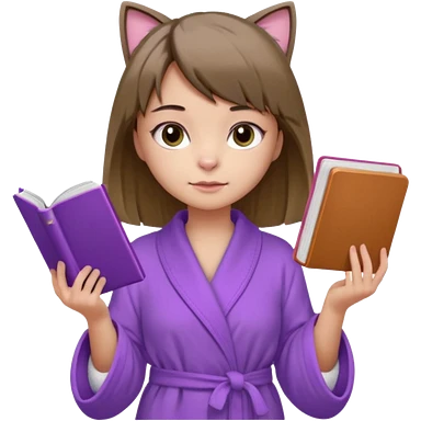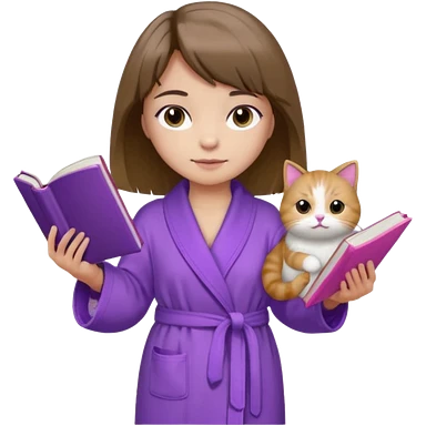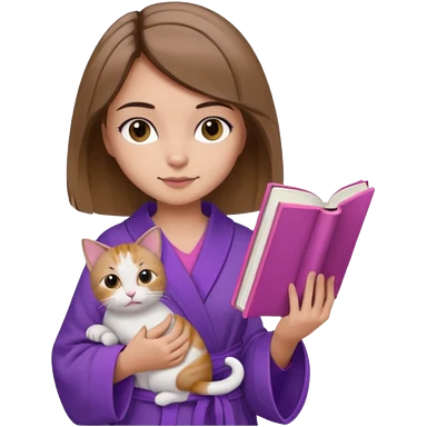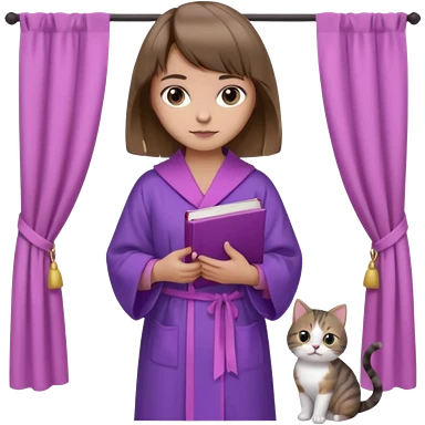 Девушка с короткими волосами до плеч русого цвета, посередине головы есть чёлка шторки, с черными бровями, карие глаза, у неё фиолетовый халат, стоит в полный рост, в руках она держит розовую книгу, а возле ноги сидит кот emoji