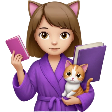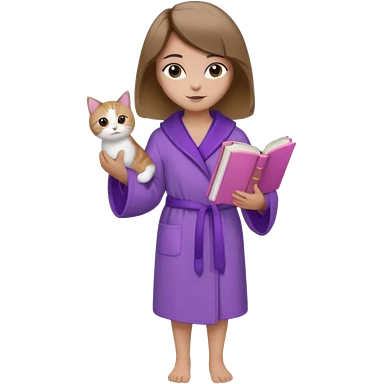 Девушка с короткими волосами до плеч русого цвета, с черными бровями, карие глаза, у неё фиолетовый халат, стоит в полный рост, в руках она держит розовую книгу, а возле ноги кот emoji