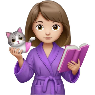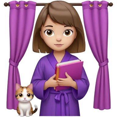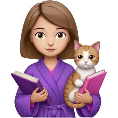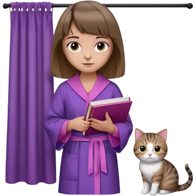 Девушка с короткими волосами до плеч русого цвета, посередине головы есть чёлка, с черными бровями, карие глаза, у неё фиолетовый халат, стоит в полный рост, в руках она держит розовую книгу, а возле ноги сидит кот emoji