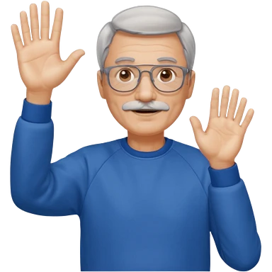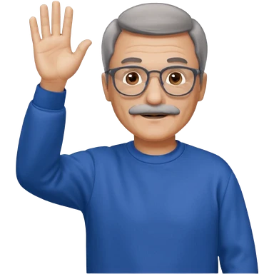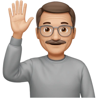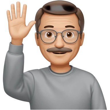 60 yr man with partially gray hair, mustache, light glasses, sweatshirt, waving hello emoji