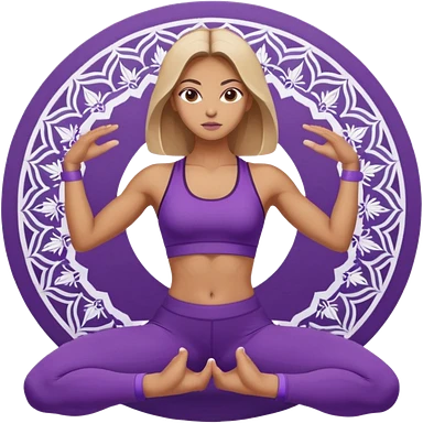 A woman in purple activewear holding warrior two pose, centered with a white mandala pattern behind her. emoji