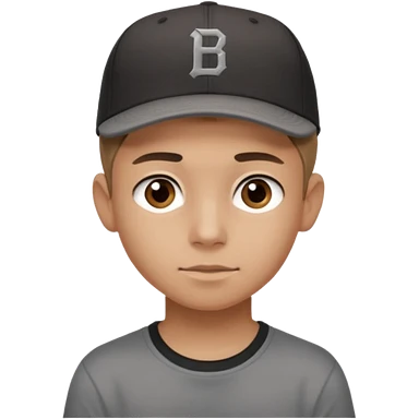 Create a teen boy wearing a faded black T-shirt. He will have light brown hair that is buzzed, tan skin, and dark brown eyes. He is wearing a gray baseball hat turned backwards. emoji