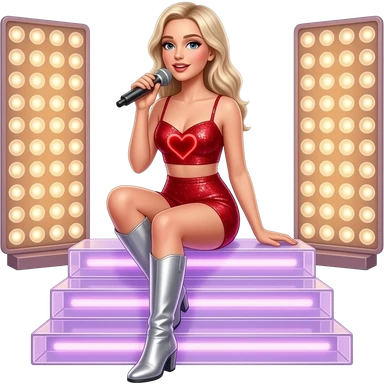 Sabrina Carpenter platinum blonde hair wears a red sequined two-piece with silver boots red heart outline while singing, seated on glowing translucent steps that are backlit with a cool, lavender-tinted light, In the background, two large rectangularlight banks provide intense, warm illumination emoji