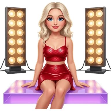 Sabrina Carpenter platinum blonde hair wears a red sequined two-piece seated on a wide, glowing translucent platform or runway that is backlit with a cool, lavender-tinted light, In the background, two large rectangular light banks provide intense, warm illumination emoji
