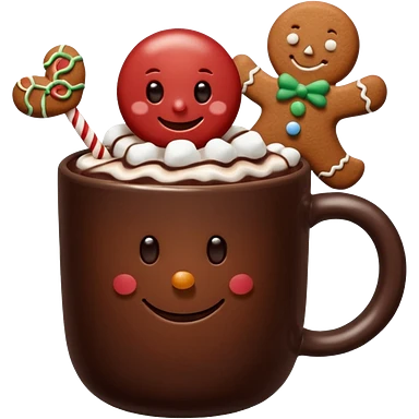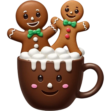 A hot chocolate with a gingerbread man and marshmallows emoji
