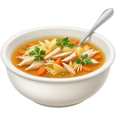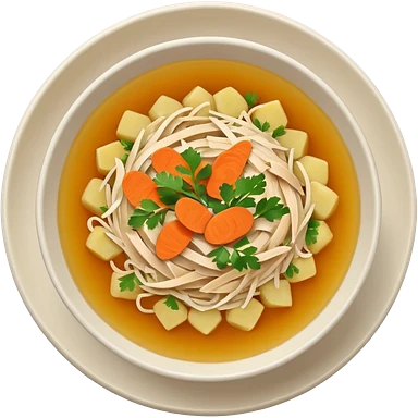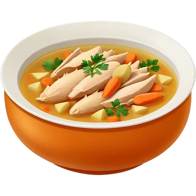Emoji of a Mexican chicken broth (consomé de pollo): a warm golden soup with bits of shredded chicken, carrot, potato, and cilantro in a simple round bowl, viewed from above emoji