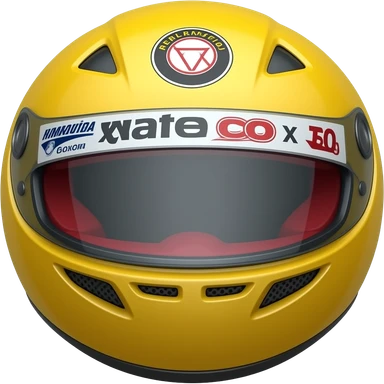 A scene of a yellow ball with helmet window at the front with racing car sponsors emoji