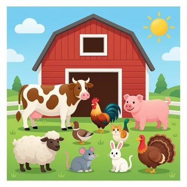 Farm animals in the barn: Cow, pig, rooster, dog, duck, cat, chicken, sheep, goat, mouse, rabbit, and a turkey emoji