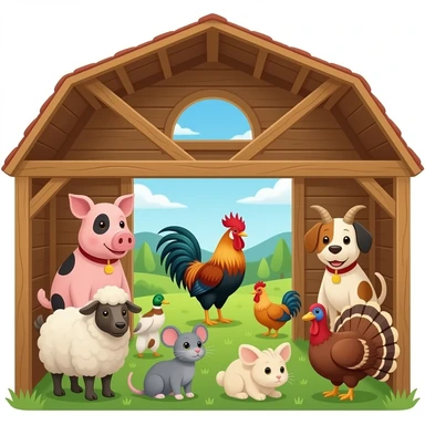 Farm animals inside the barn: Cow, pig, rooster, dog, duck, cat, chicken, sheep, goat, mouse, rabbit, and a turkey emoji