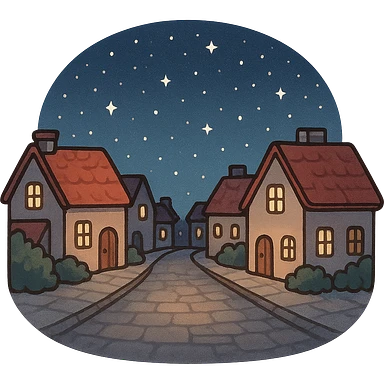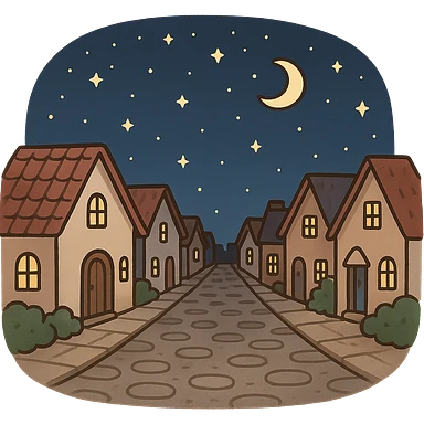 一个复活节的场景,一个街道,两边都是小房子,中间是一条街道,夜晚,星空 emoji