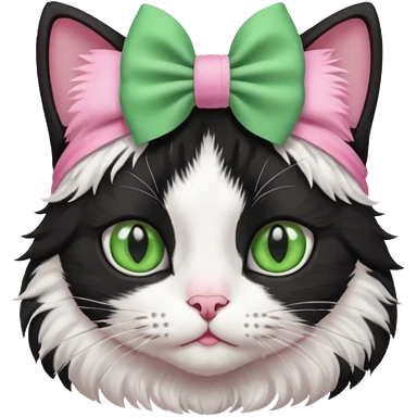 A black and white cat with green eyes she has a hot pink bow on her head emoji