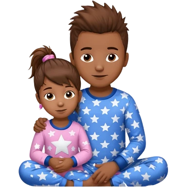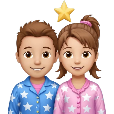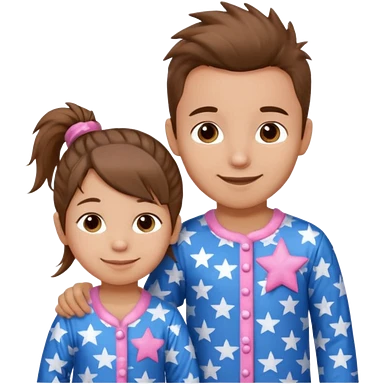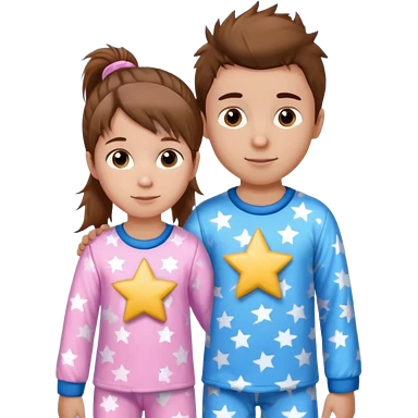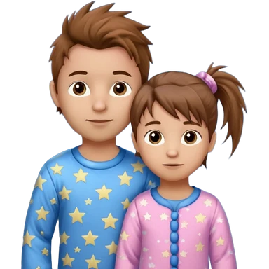 4 year old brown spikey haired boy with blue pajamas with stars on them and a 1 year old brown haired pony tail girl with pink pajamas, and stars on them emoji