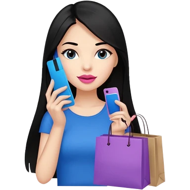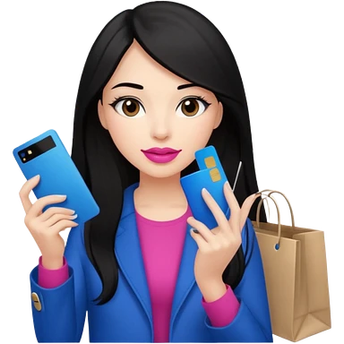 Girl with long black hair, pink lipstick, brown eyes on the phone holding shopping bags and blue credit card emoji