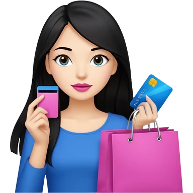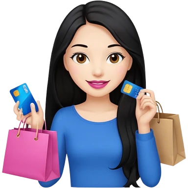 Girl with long black hair, pink lipstick, brown eyes holding shopping bags and blue credit card emoji