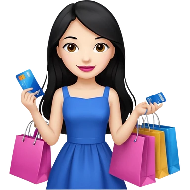 Girl with long black hair, pink lipstick, brown eyes holding shopping bags and blue credit card and wearing a dress emoji