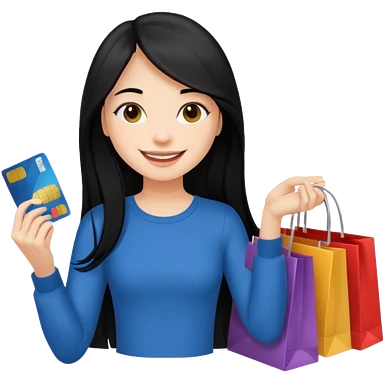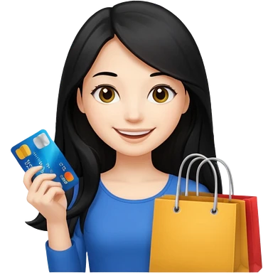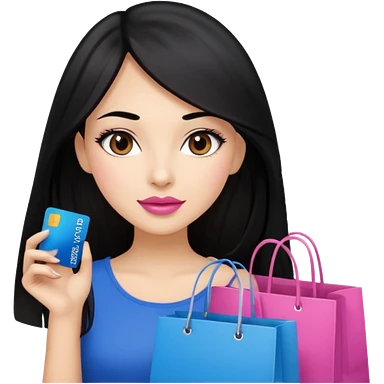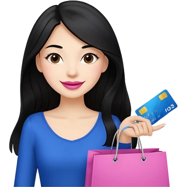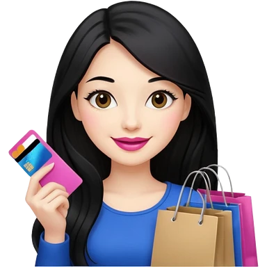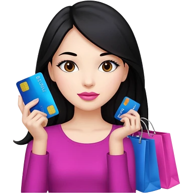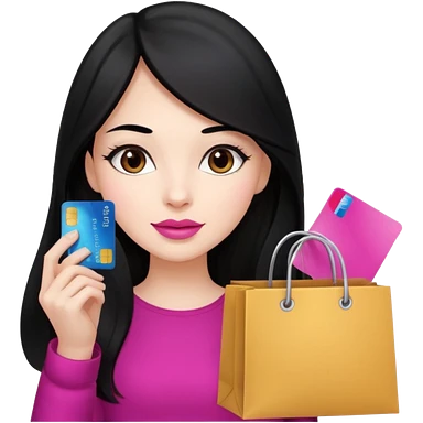 Girl with long black hair and pink lipstick holding shopping bags and credit card emoji