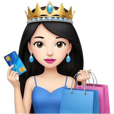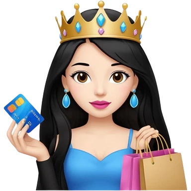 Girl with long black hair and crown, pink lipstick, brown eyes holding shopping bags and blue credit card emoji