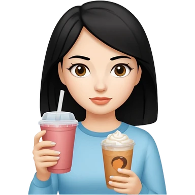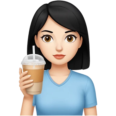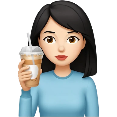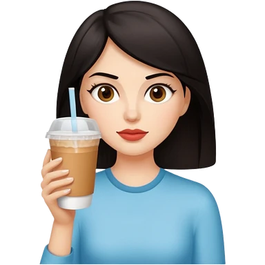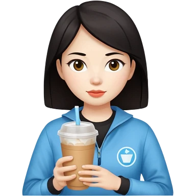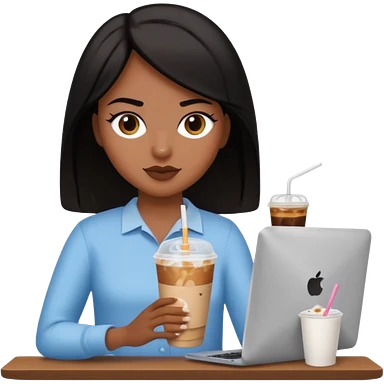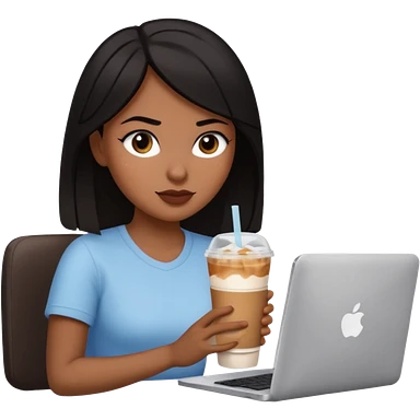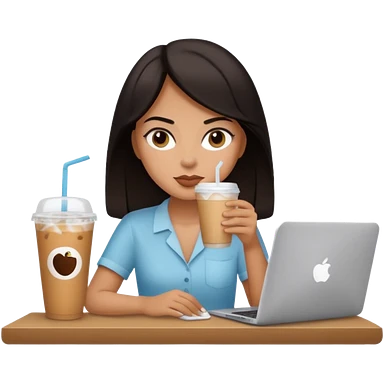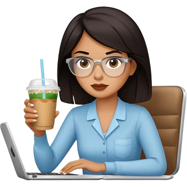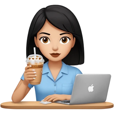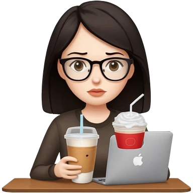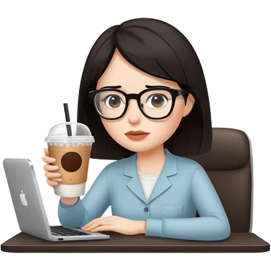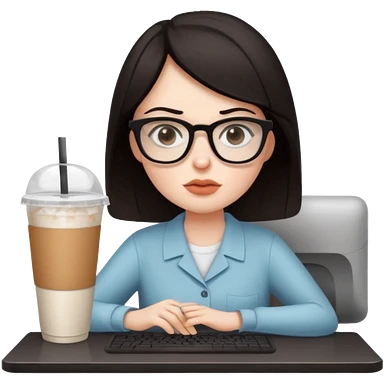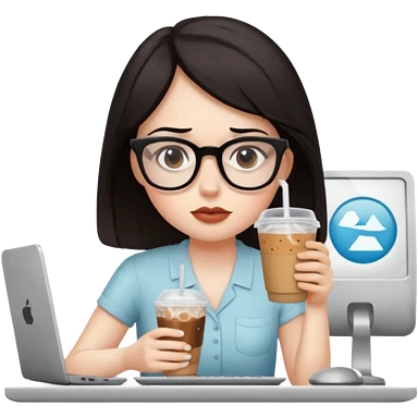 컴퓨터하면서 아이스 아메리카노(테이크아웃 잔에 담긴)를 많이 마시고 있는 다크서클 검은머리 여자 emoji | AI Emoji Generator