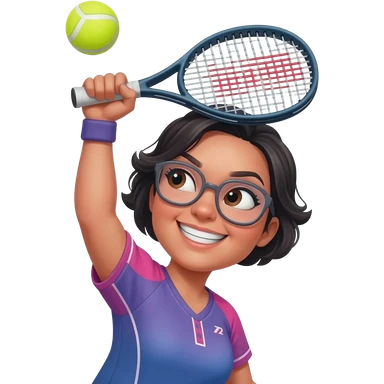 (CHANGE RACKET TO PADEL FROM TENNIS) closeup picture of a female with short dark hair and glasses, as Padel player, with Padel racket (not tennis) smashing the ball, maximally hard from above her head and really enjoying it! emoji