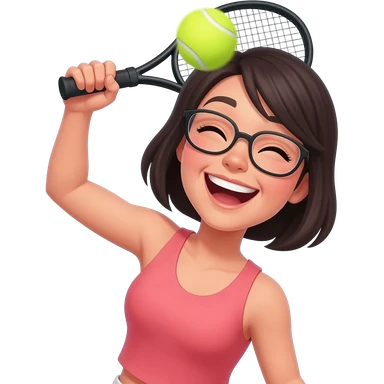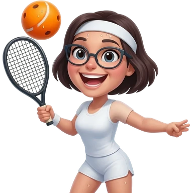 closeup picture of a female with short dark hair and glasses, as Padel player smashing the ball hard and really enjoying it! emoji